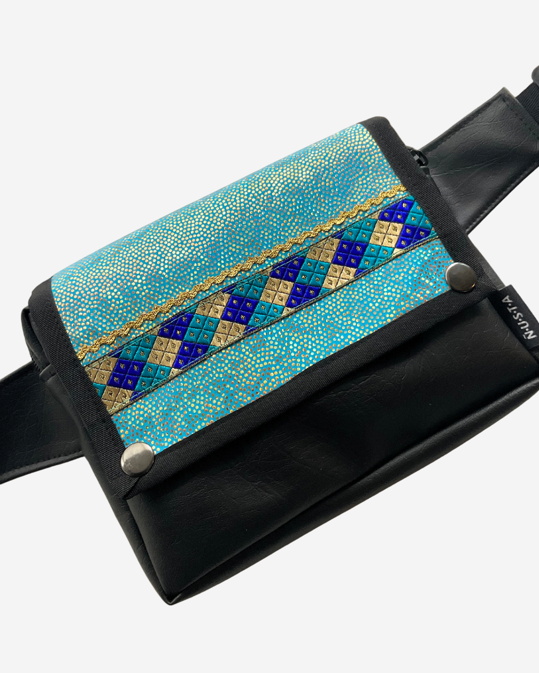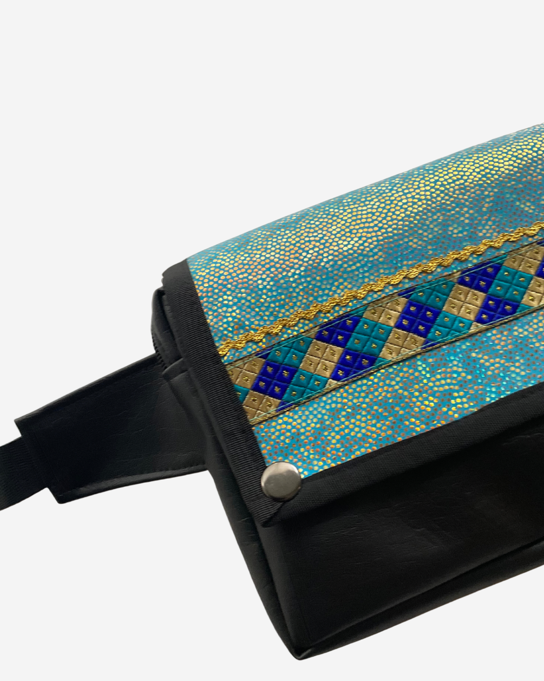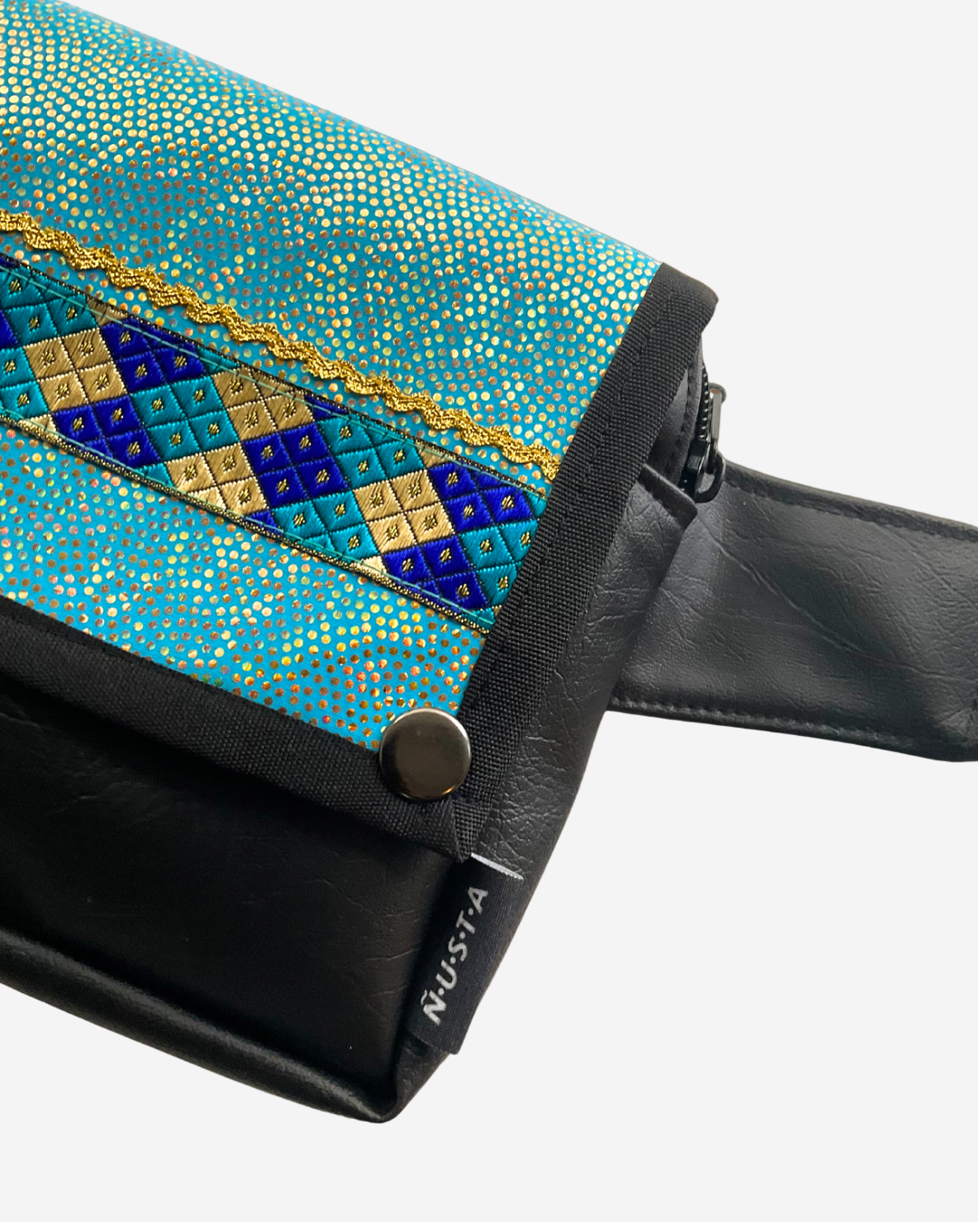 El material exterior es de ecocuero color negro, biodegradable y vegano. Tiene una tapa con 2 broches para mayor seguridad. El compartimento principal está forrado en su interior y tiene una cremallera para que resguardes tus artículos personales.