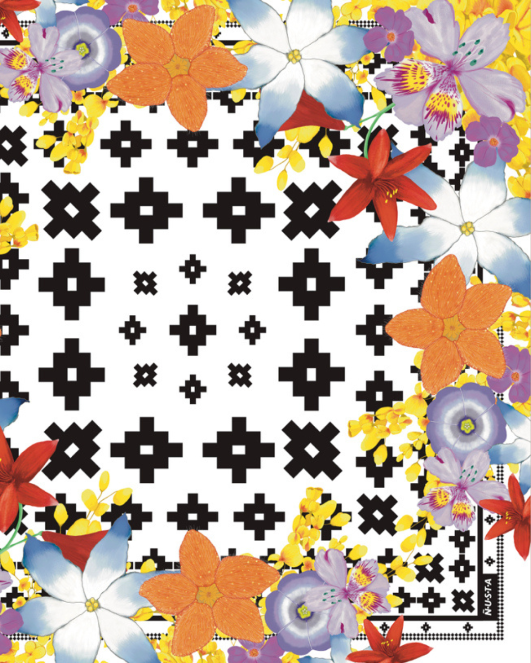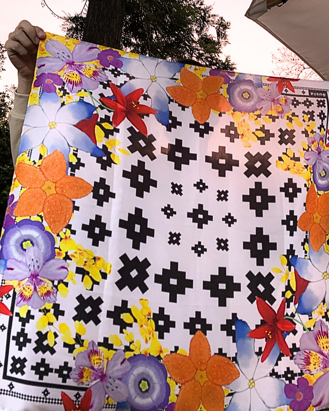 Descubre la belleza y simbolismo en cada detalle de nuestro pañuelo, donde la esencia de la Chakana se entrelaza con la gracia de las panqaritas (pequeñas flores). Chakana "puente o escalera" es un simbolo plurimilenario de los pueblos de los andes ancestrales.