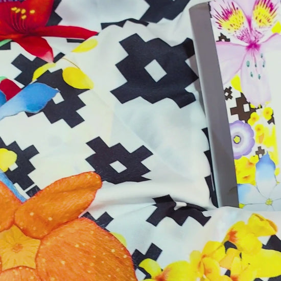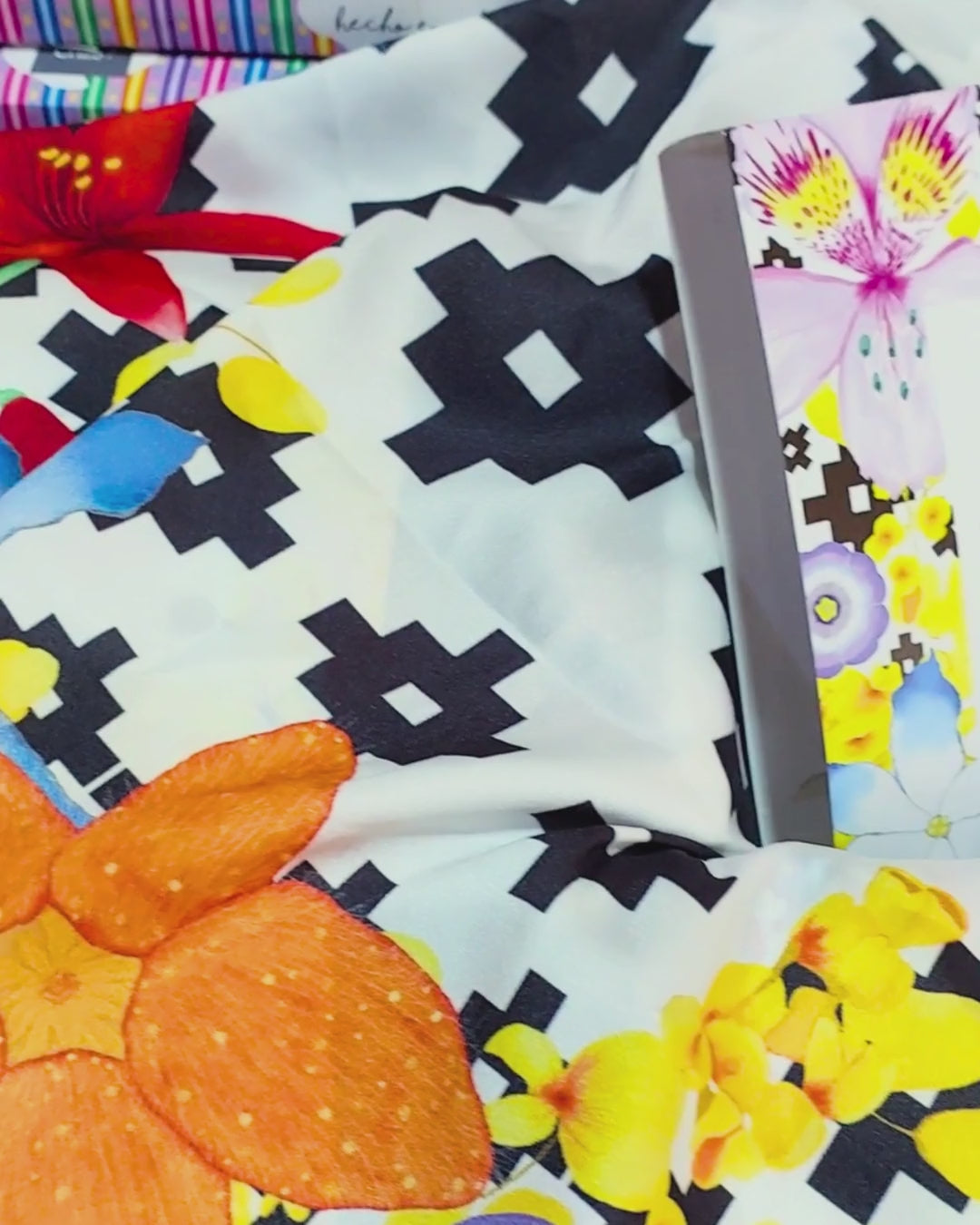 Su tela es de textura liviana y tacto satinado y suave, parecida a la seda. Está hecha a partir de botellas de plástico recicladas (RePET) e impresa con tintas ecoamigables. Nos basamos en la producción sustentable, ecológica y respetuosa con el medioambiente.