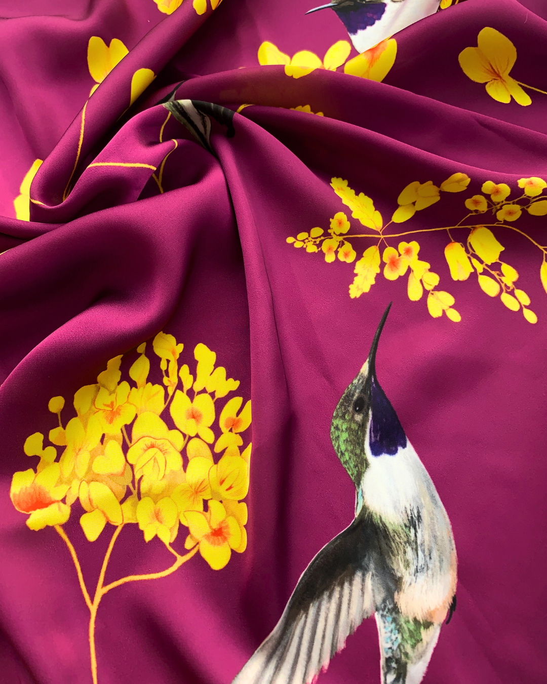 Su tela es de textura liviana y tacto satinado y suave, parecida a la seda. Está hecha a partir de botellas de plástico recicladas (RePET) e impresa con tintas ecoamigables. Nos basamos en la producción sustentable, ecológica y respetuosa con el medioambiente.