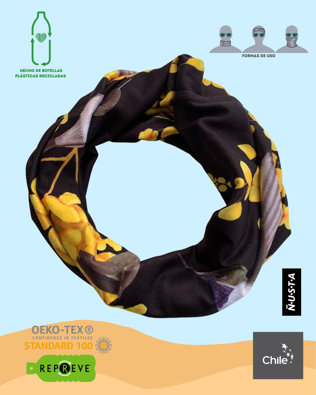Vive tus aventuras con estilo, protégete del frío y viento con las bandanas sustentables de textura suave. Complementa tu outfit con los múltiples usos de protección para tu cabeza y cuello. Inspírate todos los días con los diseños ilustrados del norte de Chile y la cultura andina